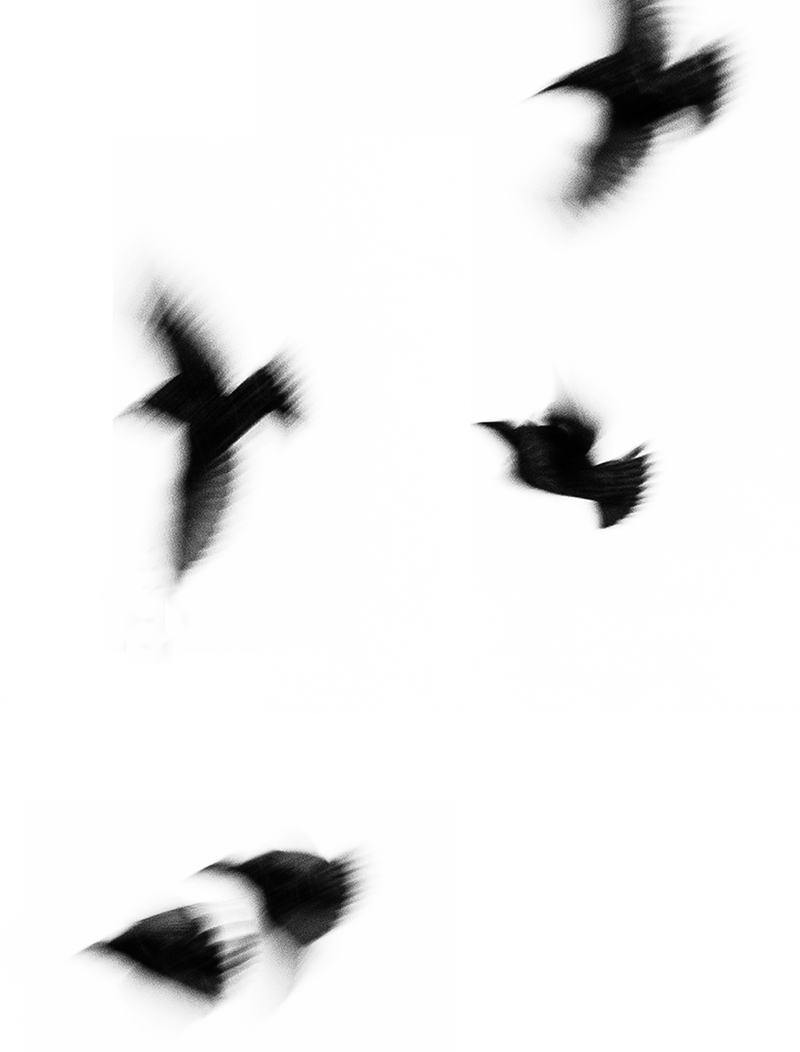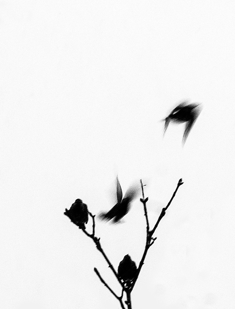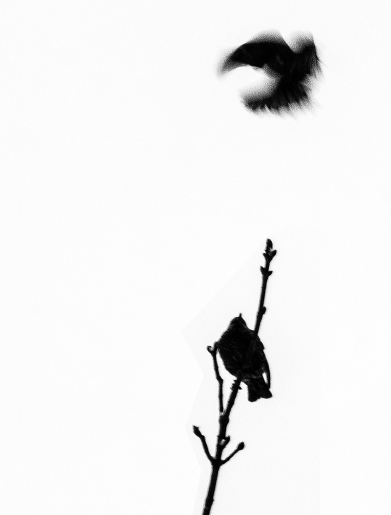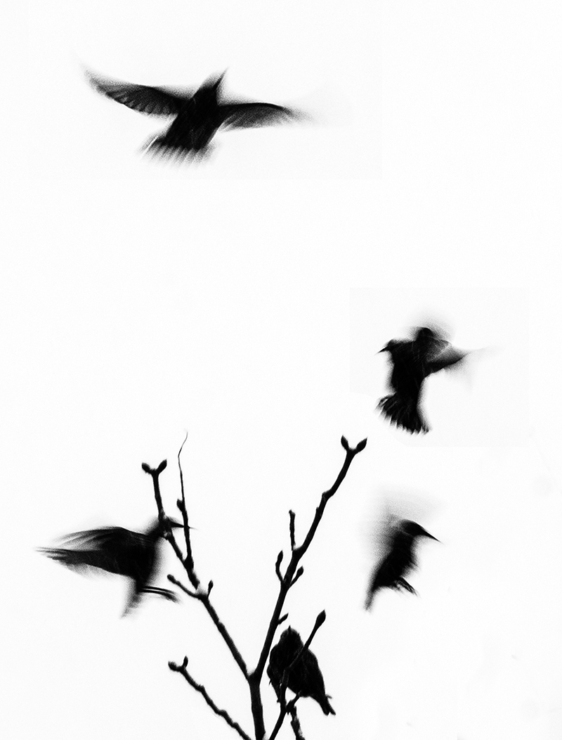 La surface photographique capte le vol de ces oiseaux d’une manière picturale. Proche de l’abstraction par moment, l’image fige le va-et-vient incessant de ces volatiles sur l’aplat blanc du ciel.